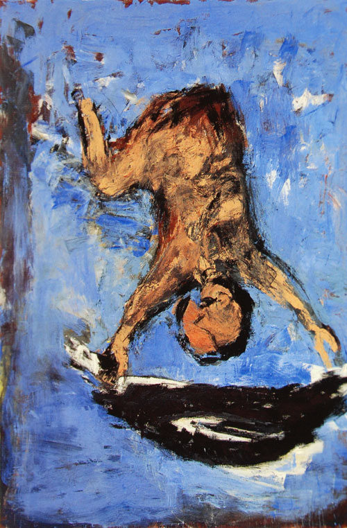 J’ai réfléchi un peu à la chose. Je crois que ce qui m’a sidéré en l’occurrence est une question de probabilités. Combien y avait-il de chances pour que Bazelitz, peignant une espèce de baigneur - une pièce de viande - tenant un parachute à l’envers sur un fond bleu tâché comme tout le reste, entre en communication émotionnelle avec un spectateur ? Et à quel moment s’est-il dit : "ayé, terminé, j’ai fini ma peinture, elle fonctionne" ? Et qu’il se le dise encore - tous les gosses qui crabouillent estiment au bout d’un temps que leur gribouillage est abouti - mais que ça marche, que je sois là planté devant le gros cul sans pieds à me dire que j’aimerais tant, ne serait-ce qu’une fois, faire quelque chose comme ça, qui parle immédiatement comme la musique, wow ! Fort.