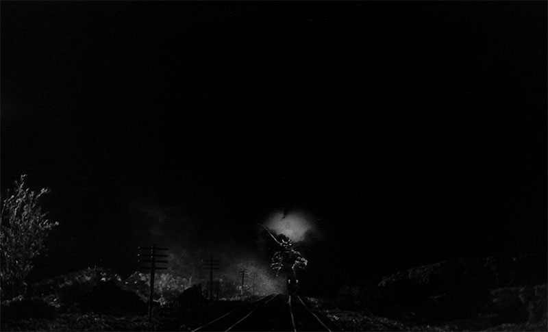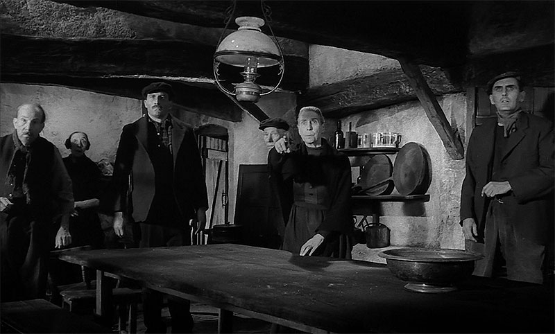 Il aurait fallu s’arrêter là, dans quelque chose qui aurait pu être comme une apparition. Mais les producteurs ont voulu voir le Pazuzu griffu. Peu importe, le monstre à poil ne tue pas le film car Tourneur arrive à sauver l’ambiguïté, et on ne sait pas au final départir ce qui ressortit à l’imagination de Karswell de ce qui appartient à la réalité. Holden et Joanna semblent s’accommoder un peu légèrement de cette incertitude... sans doute impatients de s’accommoder sur un mode plus terre à terre... Du reste, La nuit du Démon n’est pas à voir uniquement en tant qu’avatar intéressant du genre fantastique. Des grilles de lecture sociologiques, psychanalytiques et esthétiques méritent d’être appliquées sur ce film plus complexe qu’il n’y paraît : Holden est un sans doute un mâle américain archétypique des années 50, un Don Draper avant l’heure ; ces rapports avec Joanna nous invitent à relativiser son statut de dominant dans le couple. Karswell entretient des rapports tordus avec sa mère ; on craint plusieurs fois pour cette dernière, finalement c’est elle qui contribue à la perte de son fils. Sur le plan esthétique, la deuxième photo du temps 1 ci-dessus suffirait à montrer l’attention portée sur les plans clés ; la scénographie de la scène chez les rustres est elle extraordinaire... NB : la première fois que j’ai vu ce film, il y a des lustres, j’avais aimé y retrouver la source de l’intro de Hounds of Love. En matière d’esthétique, la caution de Kate Bush n’est sans doute pas la plus mauvaise.