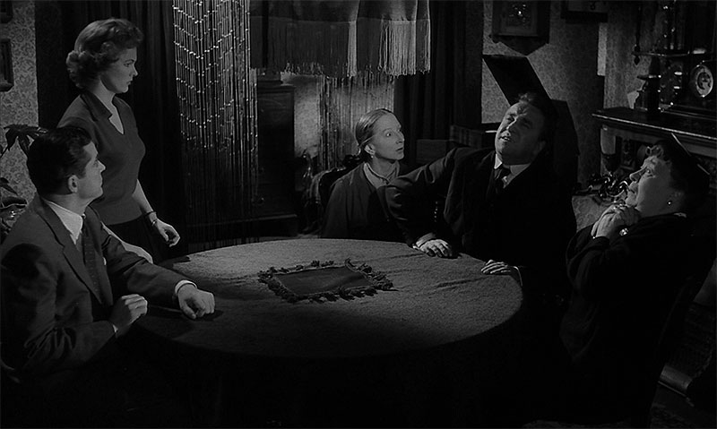 Un bon récit fantastique fait alterner les moments de tension (favorables à l’irrationnel) et les moments où la raison se rassoit. Cette scène du médium offre comme une précipitation de cette valse-hésitation. On passe ici en effet du franc comique, comme lorsque Mme Karswell traduit balourdement les propos du médium ("he means you must give up this investigation" :-), au franchement inquiétant lorsque le mage en sueur semble revivre la fin terrifiante (ou pas...) d’Harrington.