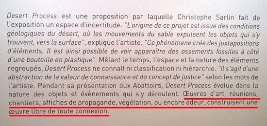 C’est moi qui souligne la dernière phrase car elle m’a bien interpellé. Créer une œuvre libre de toute connexion : si ça ce n’est pas aller à rebours du monde où tout s’interconnecte à une vitesse terrifiante... Je joue sur les mots ? Christophe Sarlin pense à la connexion entre les objets qui constituent l’œuvre et moi je vais chercher la connexion qui fonde notre âge numérique ? Attendez un peu que la cafetière discute avec la montre, le pace-maker avec la compagnie d’assurance et les réseaux sociaux avec les réseaux neuronaux... Quand nous serons tous à poil, prévisibles, jour et nuit connectés, elle pourrait nous parler la liberté des liens non tissés. Desert Process, demain sans doute une idée convoitée.